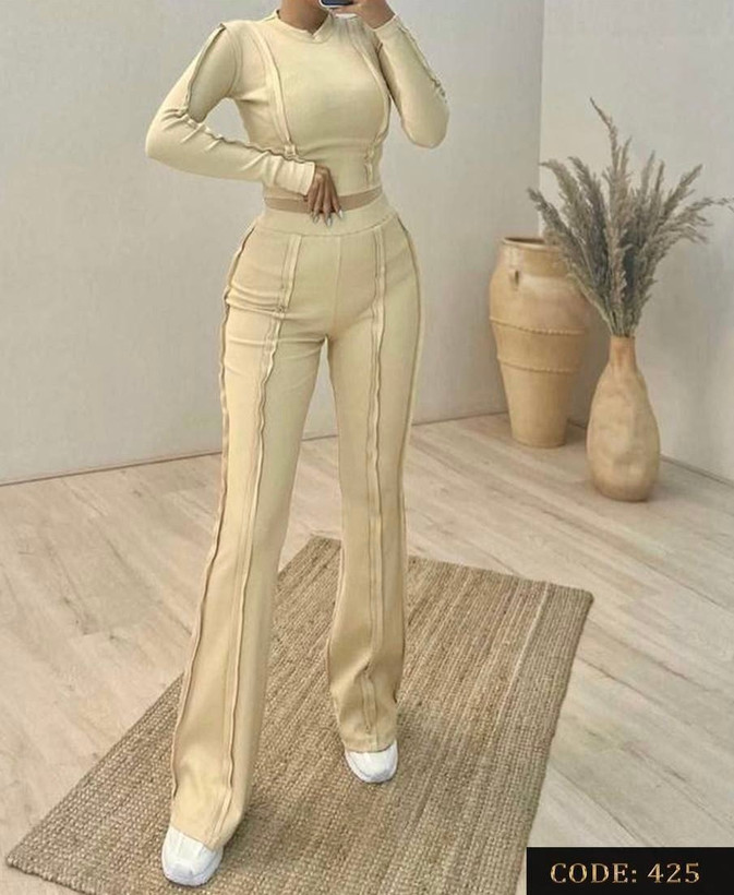 ست کراپ و شلوار رگه دوزی تک رنگ
